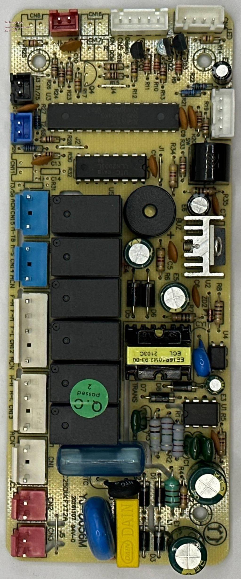 Thinking about how to swtich referred dehumidifier ("DH") on and off via relay (and its control chain) with the objective running the DH only when the humidity is above some level (Maybe 55%) and when the time of use power is cheap, that is it won't run during peak power periods. Thing is it does not have a simple main on / off switch, rather turing it off involves pushing a button, and then it times out some turn off cycle, and does not like being turned off by pulling the plug, also has its own auto function which sort of works humidity wise but does not have the timing logic incorporated. Circuits not been found to date but by chance I found a site with pics of part, there are two boards, the switch board looks like this: