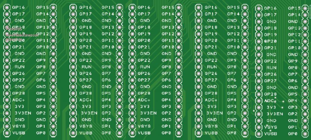 Mixtel90 your good at whipping out boards real quick. How about an experimenter board using female long pin headers and an array of pads give 2 connected pads for 1 header and 1 for hookup use. LOOKING AT TOP VBUS o-o o o o o o-o GP0 VSYS o-o o o o o o-o GP1 GND o-o o o o o o-o GND 3EN o-o o o o o o-o GP3 VREF o-o o o o o o-o GP4 GP28 o-o o o o o o-o GP5 ~~~~~~~~~~~~~~~ GND o-o o o o o o-o GND GP17 o-o o o o o o-o GP14 GP16 o-o o o o o o-o GP15 could also be used on the pico for DIY use making things smaller. Just random thoughts tonight LOL Quazee137 Edited 2024-07-28 17:08 by Quazee137 |