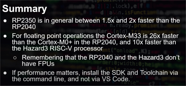 There are errors in his video. The RP2350 only has a single precision H/W FPU and a double precision software co-processor that is better than the compiler but not hugely (neither accessible from the RISC processors). I don't know how he managed to get windows to compile so badly but my environment doesn't (tested against a build on a Pi5 with a hand installed SDK - no difference). You don't want to believe everything you see on the internet ![]() Edited 2024-10-21 01:25 by matherp |