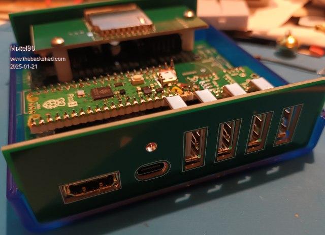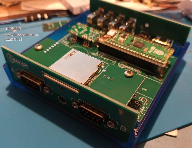 Up and running so far. The USB problem was a couple of dodgy solder joints. I've decided that I don't like that method of of mounting the USB hub very much, it'll probably plug into 2mm headers next time. I've had the full complement of keyboard, mouse and two generic controllers on it. I'm quite impressed by the audio from that 12-bit DAC. There is enough output to drive my 64R headphones to just over a comfortable volume for me, making PLAY VOLUME useful. I'm not impressed by the rear Reset button as it doesn't quite line up with the hole in the rear panel. Still, it was just squeezed into the gap left on the 100x100 PCB and it should have been deeper really. I installed MMBasic in the intended way, without needing to unplug the Pico. It works well, and the DIP switches are a lot easier than links when I'm short of PCB area. The daughter board with the full size SD card socket and LED is something else that I like. *There is a PCB error!* The SD card socket GND pins are floating. Easily fixed with a link from pin 6 to the GND pin towards the rear of the daughter board. This will be fixed at the next release. The fact that everything fits into the case is a bonus. :) --------- Still not tested the HDMI other than seeing the default screen. Still haven't tested the controller ports either. If you use 1K for the red LED and 1K5 for the green one you get a nice alternating flash of green/orange for the heartbeat. :) Mick Zilog Inside! nascom.info for Nascom & Gemini Preliminary MMBasic docs & my PCB designs |