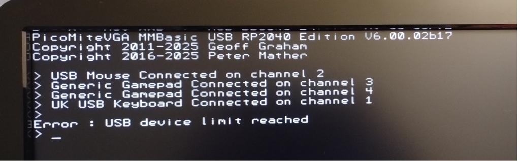 Hello Peter, I've tested b17 and can confirm that both these gamepads now work as expected, Thank You! However if I power-cycle the machine with both gamepads attached I get this (apparently harmless) error: ![]() Just to get them off my chest here are a couple of comments about gamepad support for you to take note of or not: Since the SDL team haven't succeeded it's unlikely you will even be able to support every possible gamepad (even excluding those that just don't work at all due to the limitation of Pico/USB) so is it possible to provide better support for users to add their own ? As I understand it the GAMEPAD CONFIGURE command has to be run before attaching a gamepad, is there no mechanism (configuration file, OPTIONs, doing a little dance) that would allow user configuration whilst the gamepad is attached ? At a simplest level I'm thinking that for their unsupported gamepads a user could keep their gamepads attached and have an "A:/config-gamepad.bas" that they manually after each boot if they want to use their gamepads. YMMV, Tom Edited 2025-03-10 23:00 by thwill MMBasic for Linux, Game*Mite, CMM2 Welcome Tape, Creaky old text adventures |