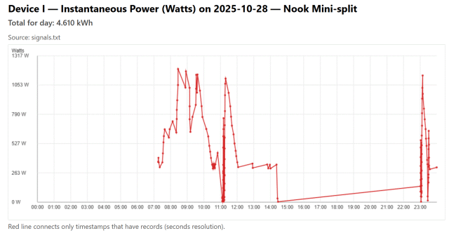My prompt for today, after I got a current sensor on my newly-installed mini-split heat pump. It took a few passes, because it assumed the python default installation on, for instance, a Raspberry Pi, rather than my minimal installation on a Seagate Dockstar flashed with the openWrt Linux distro. But then: ![]() I said I wanted instantaneous current draw in watts. ![]() I need to make some adjustments in how I'm recording the data. For instance, the mini-split was off from 14:30 to 23:30, so the line should be flat at zero--but to get that I have to make a change in the berry script which is running on the Tasmotized Sonoff POW R3 current sensor. PicoMite, Armmite F4, SensorKits, MMBasic Hardware, Games, etc. on fruitoftheshed |