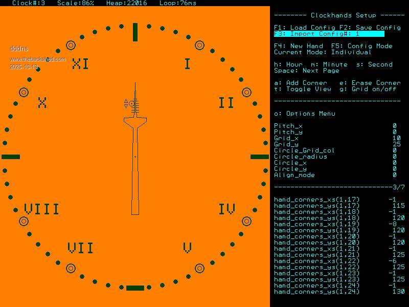 I have written an UI to build an analog clock with various elements. All the parameters can be setup with this, at the moment there are 5 designs which can be altered as you like. There are 3 sections for dimensions, colours and the clock hands. Every section can be saved to disk or the whole object as a snapshot.