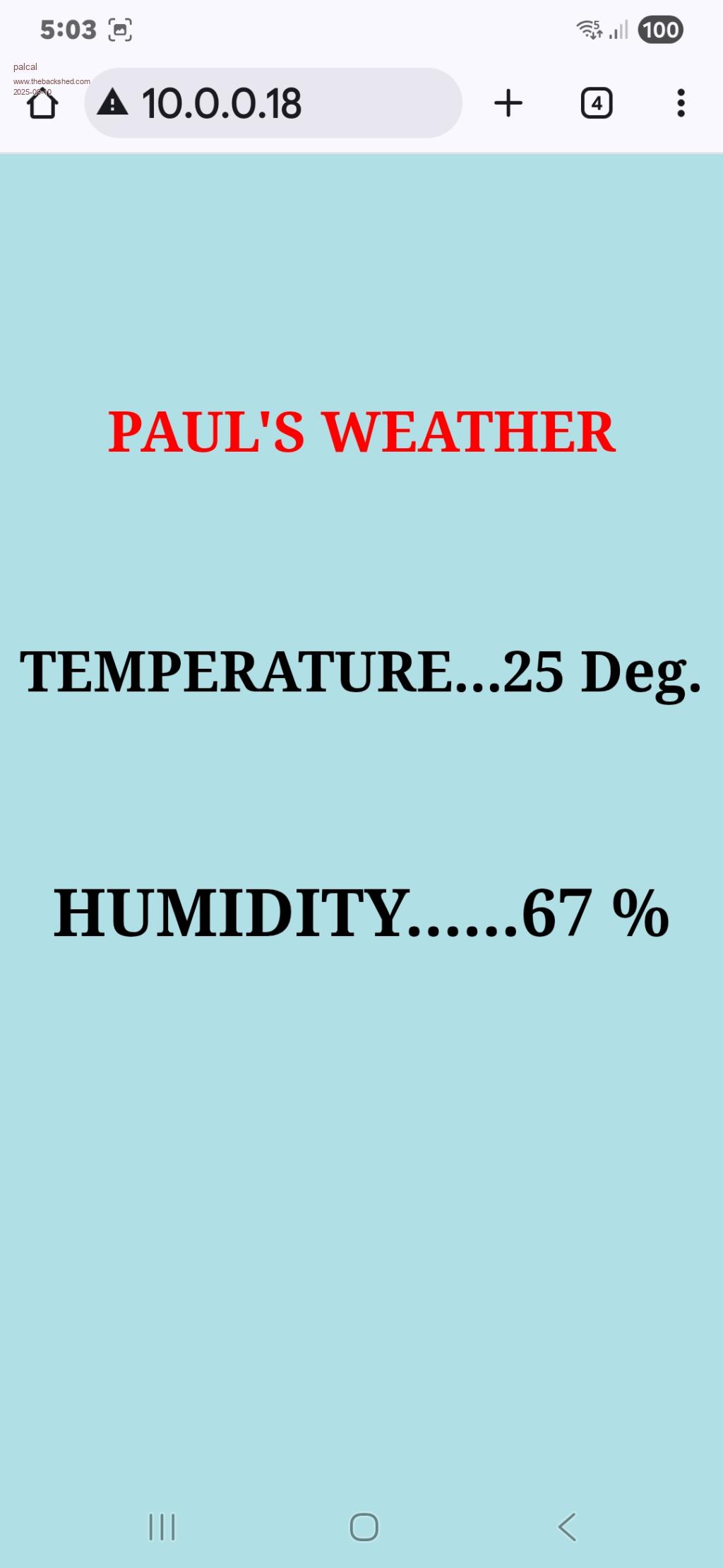 I am sending a web page with weather information to my phone. The code I used was from TBS member Luc HERE The code I am using is <br> <br> <br> <!DOCTYPE html> <head> <title>PAUL'S WEATHER</title> <meta name="viewport" content="width=device-width, initial-scale=1.0"> </head> <br> <body style="background-color: PowderBlue"> <CENTER><h1 style = "color: red">PAUL'S WEATHER</h1><CENTER> <br> <br> <CENTER><H1>TEMPERATURE...{temp} Deg. <H1><CENTER> <br> <CENTER><H1>HUMIDITY......{hum} % <H1><CENTER> </body> </html> Although I am using H1 for the font the lines come out different sizes, The 'Humidity' is slightly larger. ![]() Originally I used H4 for 'Temperature' and 'Humidity' and although they were the same size they were too small. I tried H3 slightly larger and they were bigger than the Title which is font H1. I read that this font sizing of H1 etc. is no longer used and they use CSS. I know absolutely nothing about HTML. Does anyone know how to size the font properly. "It is better to be ignorant and ask a stupid question than to be plain Stupid and not ask at all" |