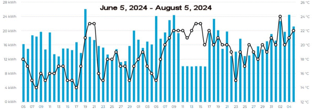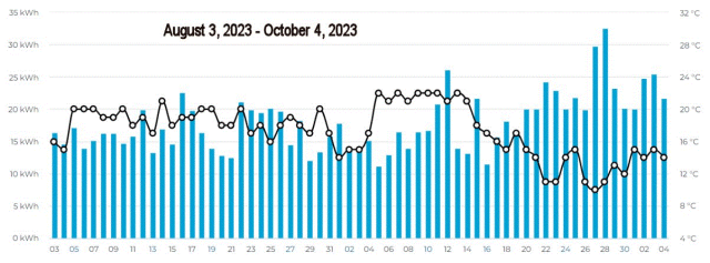 Can you extract the daily totals from these charts, and the temperature? There is one bar per day--obviously at different scales since one chart covers 8 months and the others 2. The kWh scale is on the left with one cyan bar per day with a space between days. The temperature scale is on the right, and the temperature is a black line--analog, I'm afraid, not a per-day average.