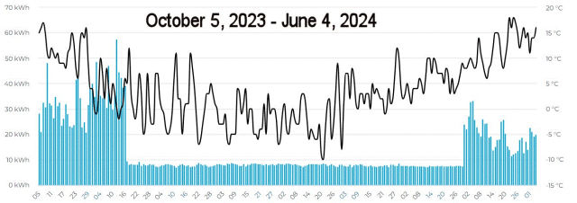 The kWh data is solid for energy analysis. The temperature data is useful for trend/seasonal analysis but I'd treat individual winter-day values with some skepticism — the analog nature of that line plus JPEG compression of very fine chart features made it the limiting factor here.
