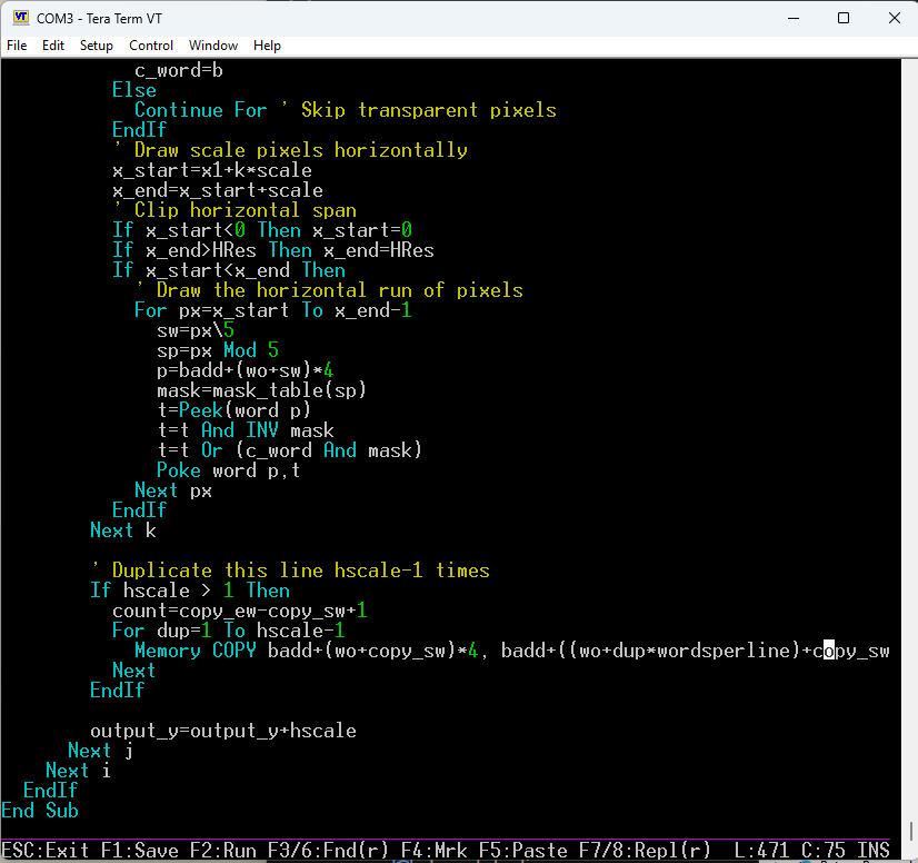 Hi Peter, Looks good. Maybe : ESC:Exit F1:Save F2:Run F3/6:Find/r F4:Mark F5:Paste F7/8:Repl/r L:471 C:75 INS Replace the "()" with a "/" save 2 characters you can use for the i in Find, and a in Mark. Volhout Edited 2025-11-28 20:30 by Volhout PicomiteVGA PETSCII ROBOTS |