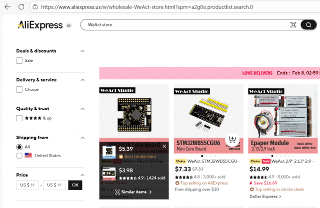 I'm getting a "Love Delivers" page, not a WeAct page. It lists several WeAct items but they are all STM32, CANFD, Mini Debugger and ESP32. Not much WeAct and no WeAct RP stuff at all. Mick Zilog Inside! nascom.info for Nascom & Gemini Preliminary MMBasic docs & my PCB designs |