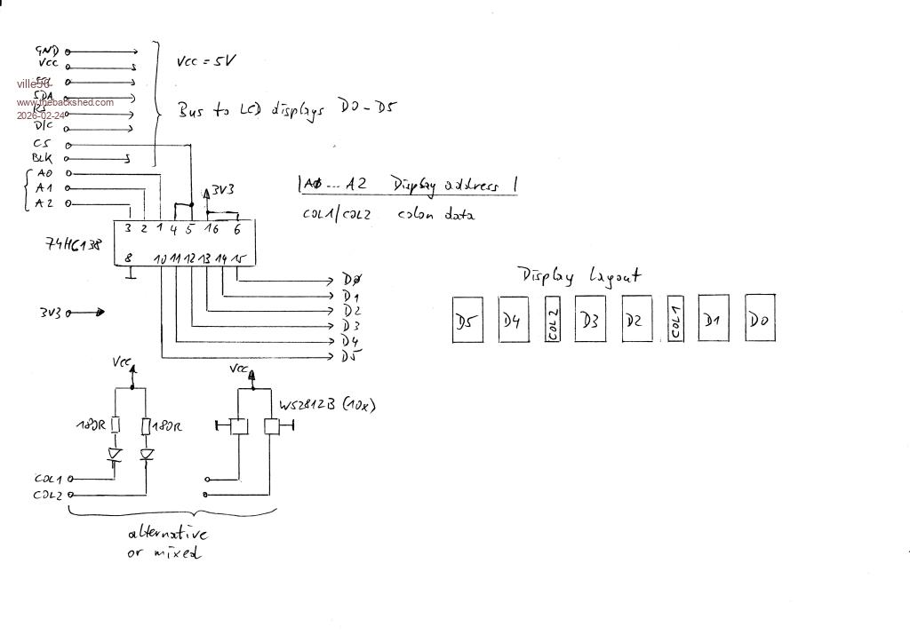 attached is the circuit diagram for the display unit as I've built it. ![]() the signal names partial buried under the watermark are: GND Ground Vcc 5V SCL serial clock SDA serial data RS reset D/C data/command CS chip select BLK backlight control I left RS bus wire floating without any issues so far, it must not (sic !) be connected to the pico if the standard MMBasic "gui reset lcdpanel" init is used for each LCD position. I'am currently reading thru the ST7789 datasheet to find out how to init the displays with poke display commands. Should be a lot faster and seems to be feasable. For the colons the LED and the WS2812B are interchangeable in my design. On the software side I still have to do a lot of improvements, so I will post the code in a few days at the earliest. I have a lot of grandpa duties as well and a doughter-in-law in the wheelchair ....73 de OE1HGA, Gerald |