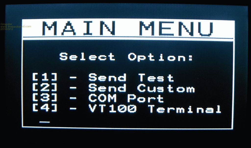 I really like the VT100 for simple B/W output from a Micromite or other. The routines I have been using recently: '------------------------------------------------------------------ Sub MENU (T$) WIPE Print #2,Chr$(27)+"[6m"; 'Select Jumbo font Print #2,Chr$(27)+"[7m"; 'Select Inverse Video Print #2,Chr$(27)+"[4m"; 'Select Underline mode Print #2,T$ 'Print menu title STANDARD 'Select standard text mode(turn all text attributes off) Print #2,NL$ 'Blank line for space LARGE 'Select Large font End Sub '------------------------------------------------------------------- Sub WIPE Print #2,Chr$(27)+"c"; 'Reset terminal Print #2,Chr$(27)+"[2J"; 'Clear entire screen Print #2,Chr$(27)+"[H"; 'Cursor to top-left End Sub '------------------------------------------------------------------- Sub BORDER Print #2,Chr$(27)+"[Z2;0;0;285;212Z"; 'Draw border box End Sub '------------------------------------------------------------------- Sub LARGE Print #2,Chr$(27)+"[3m"; 'Large font End Sub '------------------------------------------------------------------- Sub STANDARD Print #2,Chr$(27)+"[0m"; 'Standard font End Sub '-------------------------------------------------------------------