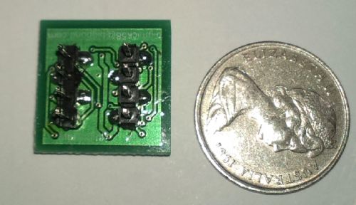 If you use the SSOP instead of the QFN, you can push the chip off to the side so that through hole headers can be used. Solder the pins in first, ensuring that they don't stick through the board, then solder the chip itself on. There's room underneath for a few 0805s, and the ICSP (USB/Serial) header is off to the side with 0.050" pitch. As drawn, the PCB is about 0.5 x 0.525 inches.
