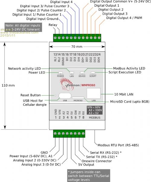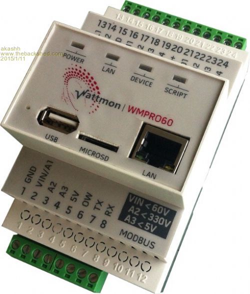 The Hardware The product consists of a master unit (I just release a new version called WattmonPRO) which is the brain of the system. It runs on anything from 5 to 60v DC and is ideally directly connected to a battery bank. It has Ethernet, a USB host port that supports several cellular dongles for low cost remote monitoring, and an SD card for storage. An embedded web server provides a convenient responsive interface for all devices from smart phones to large screens. Several onboard connectors make basic data collection and control easy: 4 isolated digital inputs, 3 of them with pulse counting let you hook up flow meters or other counter devices. 4 open collector outputs let you hook up SSRs or small relays to control things. A built in isolated relay can handle 5 amperes of current, ideal for powering a small load. On the analog side, the power supply voltage is measured through one channel. A second channel can read voltages up to 330v DC, such as a large high voltage battery bank. A third input handles 0-5v dc, ideal for a sensor such as a pyranometer. The real power comes from the interfaces: an RS-485 port with Modbus-RTU support makes it possible to communicate with thousands of third party modules such as meters, relays and sensors. I created a few devices that cover most commonly required function such as isolated current sensing, analog inputs, relays, frequency measurement and PWM output. The Rs-232 serial port can be used to collect data from pretty much anything. We provide drivers to Victron and Studer inverters but could adapt them to any serial inverter protocol. And finally a onewire port makes it easy to add temperature sensors for monitoring and automated heating control.