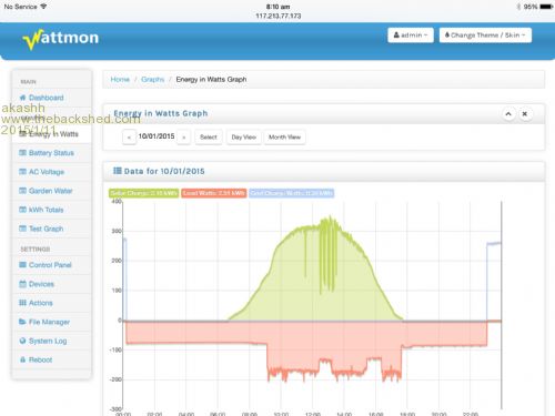 For the backshedders I will describe the internals a bit. A pic32mx795 processor runs a FreeRTOS based operating system which allows me to run up to 2 or 3 programs simultaneously. Memory is the biggest constraint and careful use of variables needs to be made or else a script will be terminated. Scripts are compiled (tokenizer) into a separate file the first time a script is run, and stored on the sd card. Scripts are buffered in RAM as they execute, meaning there is no size limit on programs, and include files can be used to combine different parts together, exactly like with PHP. An enc28j60 ethernet controller provides the LAN connectivity. A USB Host stack also supports certain cellular dongles, setting up a second network interface with PPP. This was lots of fun to implement, adapting the microchip tcp stack to support multiple interfaces. The usb stack also got modified to handle the required "modeswitch" for dongles, they first appear as SD cards and need to be reconfigured each time! All in all this has been an intensive three years for me and as I mentioned in the title of the post I would love to figure out a way to connect with people that could be interested. It is also an easy way for DIY hobbyists to create simple projects. I would be happy to answer questions here, or if you would like, just visit www.wattmon.com . Here is a graph of daily solar production and load for yesterday, as seen on the iPad. This is generated from the webserver on Wattmon dynamically.