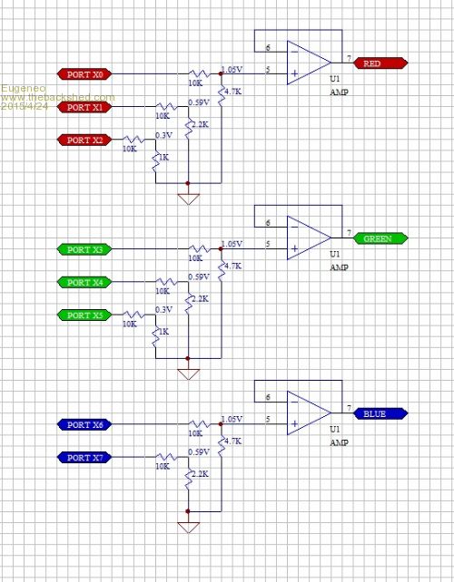 Any thoughts on this? If we went with a quad op-amp the output voltage would be more accurate. It does add an extra IC. Is it worth it? Good thoughts on the 3-2-3 color eye sensitivity. Here's a 3-3-2 color scheme.