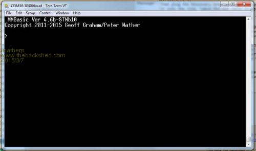 Then open up a terminal on your PC (Teraterm or MMEdit) and connect to the appropriate serial port for the TTL adapter (38400 baud) - exactly the same as for a normal Micromite. Click the Reset button on the discovery board and you will get the ARMmite copyright message and the command prompt - you are then up and running.