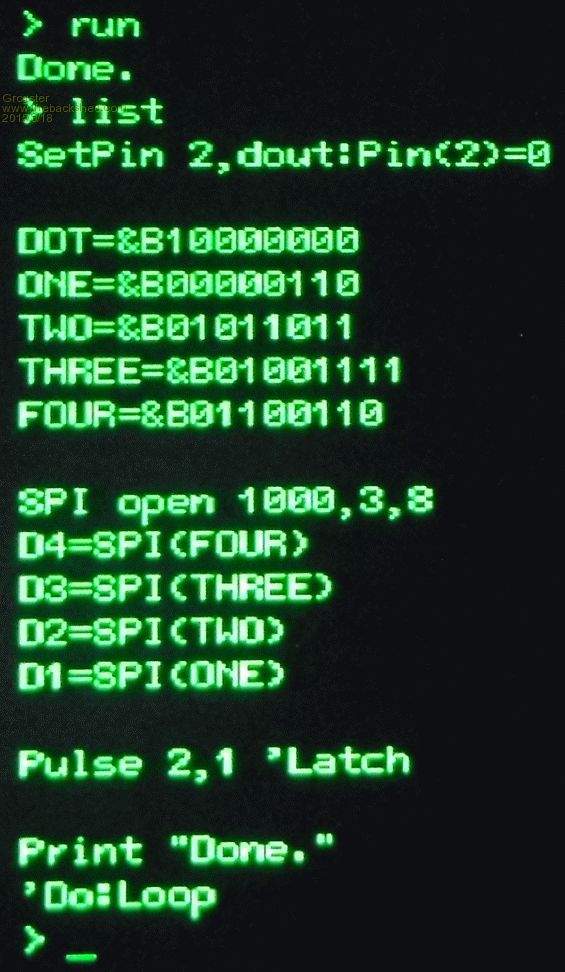 Perserverence seems to be yeilding results. Two mistakes I was making: 1) Forgot to connect the LED display GND to the Micromite GND, as I was using a different supply for the LED display due to it's current consumption 2) You need to leave the SPI port OPEN once you are finished. If you close the port, the display goes all "Flickery" - probably as SPI CLOSE returns the pins to a non-configured(read: high impedance) state. Code that is working is: SetPin 2,DOUT:Pin(2)=0 SPI OPEN 1000000,3,32 D=SPI(&B10000000100000001000000010000000) Pulse 2,1 'Latch line Do:Loop This code lights all the decimal-point LED's. Replacing with all zeros for the SPI command turns all the segments off. This is how it should be. Progress!