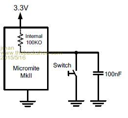 Hi If I use the above circuit from the manual and use the internal pullup Every pin EXCEPT pin 25 works. The issue remains ONLY on pin 25 So why would the debounce cap only effect pin 25 The other odd thing I tried the other way ie cap to vcc and pulldown and it works with no resets (Now I am going grey ah wait a minute I am grey already) This a look at the waveform when pressing the button all the pins display pretty much the same if not identical