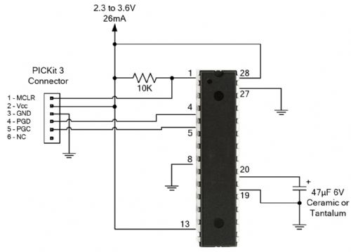 Hi Spjorus, Firstly, you will need to externally power the pic chip itself (3v3) as I have found the PK3 hasnt enough oomph to power the chip as well. Secondly I am fairly certain the VCap need to be present and you probably need a 4k7-10k Ohm pull up to 3v3 on the MCLR line. See this schematic from the MicroMite Manual for programming connections.