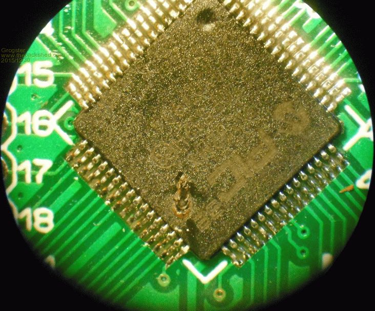 This is the board I replaced the chip on, and I did it with both the fansink and the EfCom module(white module at top-right) both still in place. Sharp angle on soldering iron, and under the microscope. Smoke makes things work. When the smoke gets out, it stops! |