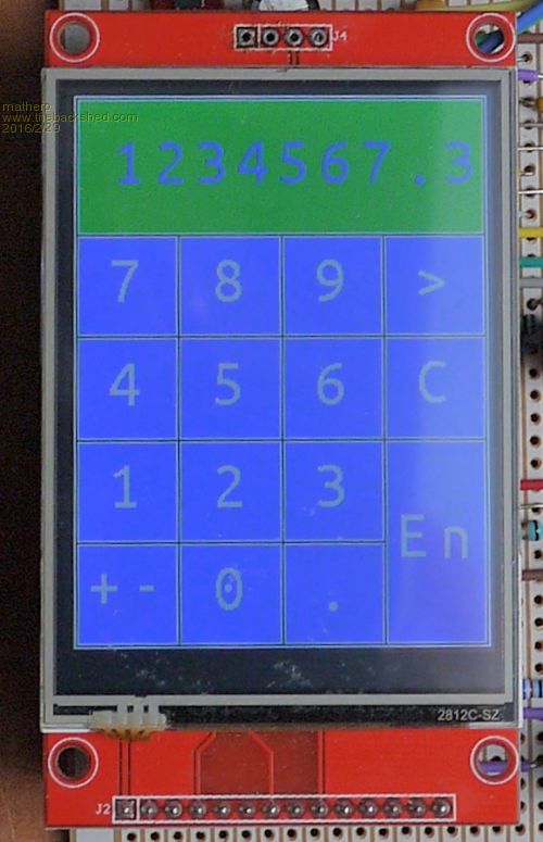 This code demonstrates a function that draws a keypad on a 240 x 320 screen in portrait mode (2.8" ILI9341 in this example) and allows the user to enter any number up to 9 digits, signed or unsigned "+-", with or without a decimal point. It supports character delete ">" and cancellation "C"