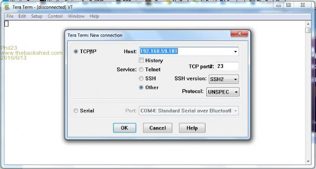 At the end of your teraterm.ini file is a telnet hosts section ;------ Telnet host list ; Max number of hosts is 200. ; You can edit this list in the [Setup] TCP/IP dialog box. ;[Hosts] ; Host name ;Host1=myhost.example.com ; IPv4 address ;Host2=192.0.2.1 ; IPv6 address ;Host3=[2001:db8:1:2:8401:02ff:fe03:0405] ; IPv6 address with interface number ;Host4=[fe80::8401:02ff:fe03:0405%3] ; Host name with option ;Host5=myhost.example.com /F=myhost.ini ; Host name with user, port and option ;Host6=user@myhost.example.com:10022 /ssh ; URL ;Host7=ssh://user@myhost.example.com ; COM1 port ;Host8=/C=1 ; Replay a file ;Host9=/R=readme.txt [Hosts] Host1=10.9.1.50:3002 Host2=10.9.1.248 Host3=tassyjim.ddns.net:3002 Host4=192.168.8.240 Host5=10.9.1.80 Host6=10.8.0.196 Host7=10.8.0.198 Host8=10.8.0.189 Host9=10.8.1.39 Host10=localhost Host11=10.8.1.28 Host12=10.8.1.25 Host13=10.8.1.24 Host14=10.8.1.32 This is the list that appears in the pulldown list when you start teraterm. Notice how I have added the port number ":3002" to a couple of the entries That is the port required for my test server. I have altered the IP addresses but you should get the idea. Jim VK7JH MMedit |