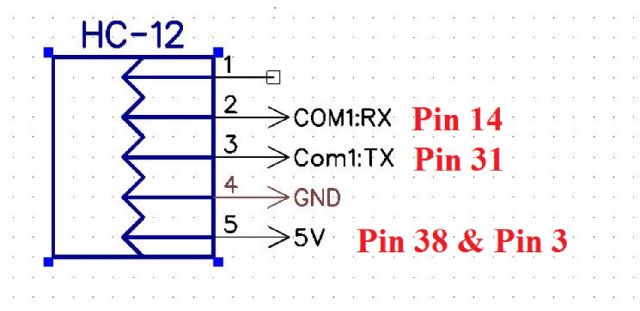 I think you have the TX RX pins OK, TX on the SC-12 goes to the 7th pin down on the RH side and RX on the HC-12 goes to 5th pin from the bottom on the left side. The VCC on the HC-12 does not have to go to any pin it just needs to be connected to +5v. or it will work on +3.3v.