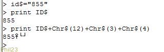 If you mean a 3-character ID, you could do ID$="855" Print #1,ID$ + chr$(12)+chr$(3)+ chr$(4) Or just Print #1,"855" + chr$(12)+chr$(3)+ chr$(4) (those others are CTRL+L, CTRL+C, CTRL+D, or FF, ETX, EOT - just checking they're what you mean) ASCII digit (printable) 8 would be chr$(56) not chr$(8), but it's a lot more understandable (often called "readable") as a string i.e. in quotes. John |