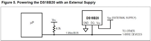 Hi Duane, I am powering each DS18B20 directly. I now see that the pullup source is determined by the logic family of the processor and that the DQ output of the sensor is and open collector so it can't source any voltage. The 4.7k resistor will provide a low enough impedance path back to the filter capacitors of the power supply so that noise transients and hum will not be likely to mess up the digital data. Thanks! Paul in Poughkeepsie |