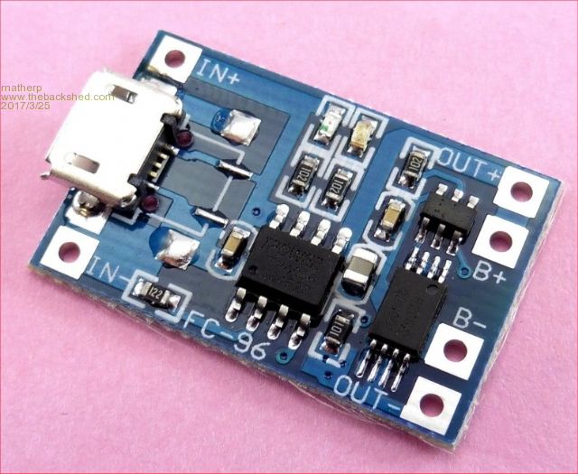Just had a look proper look at the module referenced by bill.bat and it is really quite a nice device ![]() The circuit uses a TP4056 as the charger controller and a DW01 as the discharge protection with a SSF8205A providing the two switching MOSFETs ![]() ![]() |