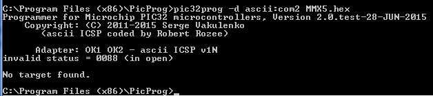 there may be some clue in the text "Version 2.0.test-28-JUN-2015". this is a very old version of pic32prog, and a test version that i have released for some specific testing purpose - for what i can not remember. download a release version of pic32prog from github and try again: https://github.com/sergev/pic32prog/blob/master/pic32prog.exe?raw=true cheers, rob :-) |
