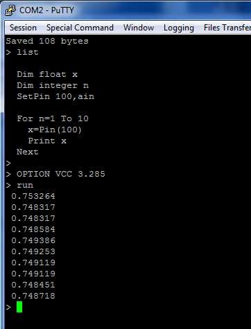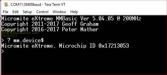 there may be some clue in the text "Version 2.0.test-28-JUN-2015". you could be a detective! Thanks Rob - I just ran the code you linked to and it went straight in. WW - I thought you meant the driver off Geoffs site. Pic32prog came from a link on TBS - obviously aged. Peter: EFH with the following: > list SetPin 100,ain Do Print Pin(100) Loop > ? mm.ver 5.0405 > ? mm.device$ Micromite eXtreme > I get a stream of zeros. Jumpering to 3v3 makes no difference late, I know, but able to test and unfortunately confirm your fears h |