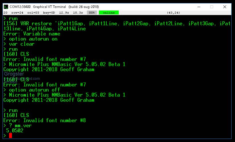 on my mm+, i have a font's test prog and all is ok run OPTION AUTORUN ON OPTION LCDPANEL SSD1963_5, LANDSCAPE, 12, 21 OPTION TOUCH 18, 14 GUI CALIBRATE 0, 3930, 0, -37000, 2147483647 OPTION SDCARD 52 OPTION RTC 43, 44 Flash: 68K (67%) Program (1095 lines) 26K (25%) 8 Embedded Fontss 6K ( 8%) Free RAM: 8K ( 8%) 15 Variables 0K ( 0%) General 89K (92%) Free 5.041 device:Micromite Plus ver:5.041 --------------- Font 1 internal Size:8x13 zoom:1 Font 2 internal Size:12x20 zoom:1 Font 3 internal Size:16x24 zoom:1 Font 4 Font #3 bold Size:16x24 zoom:1 Font 5 internal Size:24x32 zoom:1 Font 6 internal Size:32x50 zoom:1 Font 7 Sinclair_S Size:8x8 zoom:1 Font 8 (6x8) Size:6x8 zoom:1 Font 9 LCD (16 chrs) Size:32x46 zoom:1 Font 10 Ubuntu Size:24x32 zoom:1 Font 11 tiny font Size:4x6 zoom:1 Font 12 Misc_12x20 Size:12x20 zoom:1 Font 13 Dingbats1_XL Size:32x24 zoom:1 Font 14 PCgraphicsFont Size:8x8 zoom:1 2019-06-02_183137_test_fonts_mm+.zip |