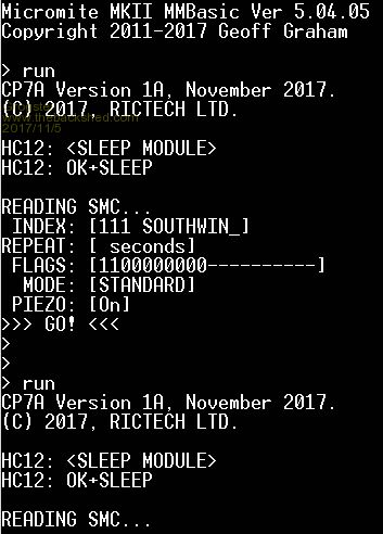 I have heard reports of the firmware being corrupted but I don't understand how it could occur. To write to flash the program has to provide a special unlock code to the CPU. This is specifically designed to stop any corruption of the flash and I cannot see how the unlock code could be accidentally generated (ie, by a runaway program).. Regardless, it will not hurt to reflash the firmware. No, not right. MMBasic needs all the bytes to be written including the size byte, this is so that when it reads back the string it knows how long it is. Before we delve into this you need to know how a string is stored by MMBasic. Take this example: D$ = "abcd" While the string is four characters long it is actually stored in memory as five bytes. The first byte is the length (ie, 4), the next byte is a, the third byte is b, and so on. When writing a string to an EEPROM you would normally allow a fixed amount of the EEPROM for each string, this is so that you can easily find a string when reading from the EEPROM. For example, allowing 16 bytes per string, the first string would be at &H0000, the second at &H0010, the third at &H0020, etc. So, the command to write the variable D$ in the third slot would be: S = UNIO(14, 02, &H0020, 16, D$) and the code to read the string in the third slot would be: S = UNIO(14, 01, &H0020, 16, E$) Note that we do not care how long the string in D$ is, it could be one byte or five. The reason we do not care is because the first byte of the string is the length byte and that will be written to the EEPROM and read back in a read command. The only significance of the length byte is that it occupies one of the 16 bytes that we are writing to the EEPROM so that the maximum length string that you can write is 15 bytes. In fact, the code should look like this: IF LEN(D$) > 15 THEN ERROR "String too long to write" S = UNIO(14, 02, &H0020, 16, D$) Normally the details of how a string is stored by MMBasic is hidden from you the programmer but in this instance you need to consider it because you are writing to physical memory locations. I hope that this helps. Geoff Geoff Graham - http://geoffg.net |
