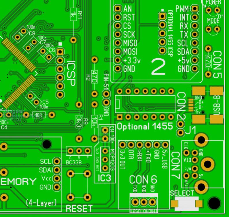 Version 1D will have the 1455 also, but I am planning to get rid of the footprint for the CP2102 USB-serial module(which is optional anyway), and also planning to discontinue CON6, which is the standard console pins, because these are now directly connected to the 1455 USB interface, so there should be no need to have them anymore, as the console now effectively has become a native USB connection as standard now on any MM using the 1455 chip.