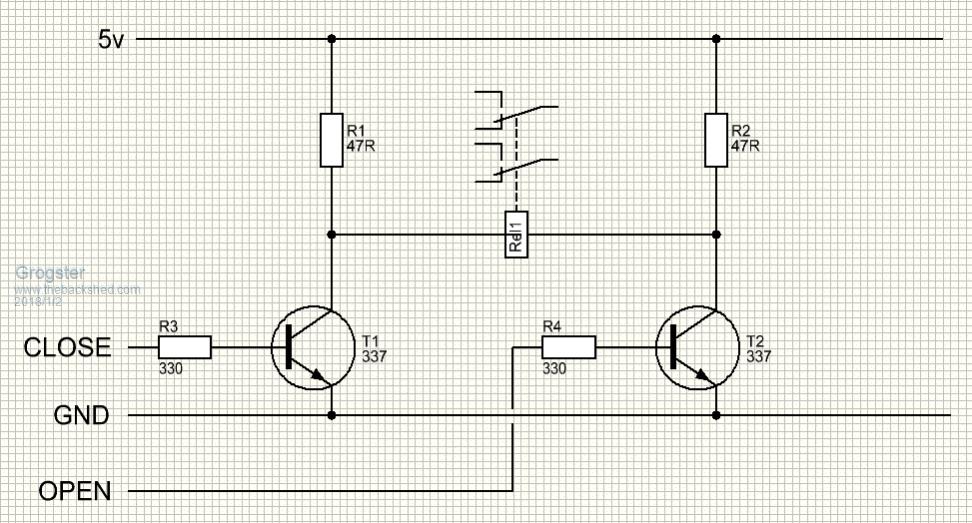 Perhaps I should clarify at this point - the relays are Panasonic latching relays, with a single coil. You have to reverse the current flow through the coil to make it latch the other way. This is done with two transistors and a couple of 47R resistors: ![]() Perhaps I can parallel up the relay coils in this arrangement, but figured a separate driver for each relay would be better design practise. I guess paralleling the relay coils would work on the same circuit when I think some more about it. Thoughts? The OPEN and CLOSE pulses from the MM are only 10mS in duration - just enough to trip the latch. The latches are 4.5v coil, so are perfect on a 5v supply less 0.6v or so loss across the transistor. Smoke makes things work. When the smoke gets out, it stops! |