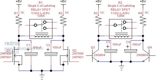 Hi Grogster;The 2N3904 has a continuous current rating of 200mA. However, this operation is not continuous. Its just a short pulse. You can't "Cook" it because the total energy content stored in the 100uF capacitor is: C * V^2 / 2 = Charge in WattSeconds 100uF * 5V^2 / 2 = 0.00125WS (or 1/800th of a WattSecond) This is quite a small charge of energy to be converter to heat. Sure, if the transistor had to discharge this amount of energy 800 times per second continuously it would be dissipating 1 Watt of power. But this can't happen because the average power dissipation is limited by the capacitor charging resistors. BTW, the energy in the other capacitor is dissipated in the relay's coil resistance. Yes, that was what I used. Although, when I tested this circuit on 12V I used 10uF ceramics. In any event the maximum current would be limited to the base current times the gain. At high currents the gain is usually quite poor so is self limiting. I suppose 240 to 1K base resistance is suitable.That may be true if there was a "True" short circuiting of the Tantalum capacitor. However, the maximum current capability of small signal transistors are quite limited. Now if a power MOSFET with milliOhm on resistance was used there could be a problem. Short circuiting failure in Tantalums is caused by microscopic fusing of the metalization in the capacitor structure. This can happen because the internal resistance of Tantalums is so low. But a signal transistor is not really capable of such high currents. I would suggest using the aluminum caps in this application. I am confident you can do this. The question is not can the transistor drive 2 coils, because they can. The actual question is "is there enough charge in the second capacitor to switch 2 relays"? I found that 33uF worked with my relay reliably. I just suggested using 100uF because I was designing very conservatively. I think 100uF will work fine. Just make sure your pads could accommodate a bit larger capacitor, you know, just in case it's needed.I wish you would consider using MOSFETs instead of bipolars. In this case, this would eliminate the base resistors. Also, unlike many application where MOSFETs are use you don't need the gate pulldown resistor. There is no harm if the MOSFET gate floated up partially turning it on as the 1K charge resistors limit the current. Rant Mode ON: I haven't used bipolars in my designs for many years. MOSFETs tend to be superior in almost every way. Lower on resistance, lower on voltage, fewer parts in the circuit, dissipate less power so don't get as hot, and less loading of the microprocessor pin. Rant Mode OFF: Have fun with this specialized small relay driver. redrok |