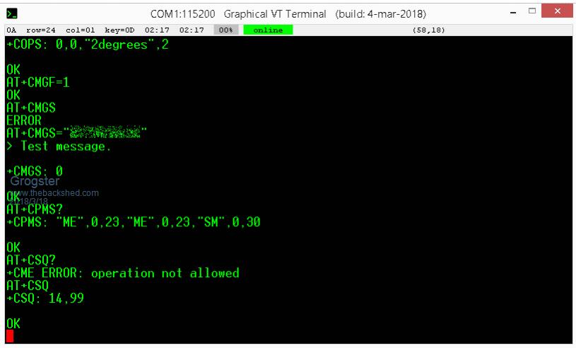 UPDATE: I received my new 3G modem this weekend. It is a very nice little unit, and comes complete with an RS232 cable, Power-supply, magnetic antenna with SMA lead and plug, Power Plug adaptor thing, drivers and PDF's CD and USB lead. Link to the one I bought It was dead easy to get going - something I have come to expect with SimCom modules since the 2G ones I played with a few years ago. ![]() This unit is based on a SIM5360 from SimCom and is a dual-band 3G compatible unit. My one is the 5360(E), which works on the 3G bands here in NZ. (UMTS 900MHz and UMTS 2100MHz) For any New Zealand members reading this, I can confirm that these units can talk to the 2-degrees 3G network, so should therefore work on any of the primary providers.(Spark/Telecom, 2-degrees, Vodafone). This unit does not support 4G/LTE networks. The unit is encased in an attractive aluminium die-cast case, measuring 86mm long, 54mm wide and 25mm deep. The single red LED on the side of the case is steady on when you first power it up, then it starts blinking at 1Hz once it has connected to the 3G network. That is very useful to have for field testing - just lets you know the unit has an active connection to the cell-phone network without you needing to connect anything up. Internal shots of the PCB: ![]() ![]() Neat and tidy, and all perfectly acceptable there. The unit accepts a standard-size SIM card, and has a nice little card-tray that you access by pressing in an 'Eject' button. The default baud-rate 115k2, but you can change that to anything from 300 baud to 4Mb! The MM UART is easily capable of 115k2 baud, so that is what I plan to use it on. (via a MAX3232) One less thing to have to configure. The full AT command set is very well documented by SimCom at 622 pages - bloody hell! This unit can do WAY more then just SMS messaging, which is all I want it for. The unit DOES NOT have any connections for a microphone or earpiece externally, as it is designed as a data-node device more then for voice traffic. The unit could probably be hacked without too much trouble to support those connections if you were desperate enough.About the only thing I WILL be changing, is the supplied plug-pack power-supply. I will be feeding the unit from the 12v UPS running the system. I have no idea of the quality of the supplied power pack, so won't be using that, although I am right now for the purposes of testing. It didn't explode when I switched it on, so there's that..... ![]() EDIT: Reading messages is also easy. By default, the unit uses the SIM card for message storage of up to 30 messages. Select the SIM card storage: AT+CPMS="SM" Read all messages: AT+CMGL="ALL" ![]() +64 is the start of my cellphone number, but I have scrambled the rest of my number for privacy. But that was my test message back to the unit. Deleting messages is done with AT+CMGD, but I have not bothered to do that, as this node is an outgoing only - it just sends SMS, and will ignore any incoming SMS. I was just playing. ![]() Smoke makes things work. When the smoke gets out, it stops! |