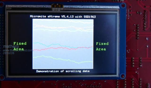 The scrolling region capability also works nicely on the SSD1963 to create a real time chart Watch another boring video here Again the new functionality makes the code very simple and I hope I'm getting to the end of the bugs - found another bizarre one this morning - right hand end of a sprite not displaying when left hand x coordinate satisfies x= 16+ n*32 const scrollxstart=100, scrollxwidth=280,newpoint=scrollxstart+scrollxwidth-2 const scrollystart=20,scrollyheight=232, scrolldirection=0 dim integer i, j, rp=130, bp=100, yp=160, wp=190, cp=70, xp=40, zp=220 cls text scrollxstart+scrollxwidth\2,0,"Micromite eXtreme V5.4.13 with SSD1963",C,1,,rgb(white),rgb(black) text newpoint+16,scrollystart-13+(scrollyheight\2),"Fixed",,2,,rgb(green),rgb(black) text newpoint+16,scrollystart+13+(scrollyheight\2),"Area",,2,,rgb(green),rgb(black) text 10,scrollystart-13+(scrollyheight\2),"Fixed",,2,,rgb(green),rgb(black) text 10,scrollystart+13+(scrollyheight\2),"Area",,2,,rgb(green),rgb(black) text scrollxstart+scrollxwidth\2,scrollystart+scrollyheight+5,"Demonstration of scrolling data",C,1,,rgb(white),rgb(black) BOX scrollxstart-1,scrollystart-1,scrollxwidth+2, scrollyheight+2,1,rgb(white),rgb(gray) do ' scroll an area defined by the x-y coordinates of the top left point ' the width of the area to be scrolled ' the height of the are to be scrolled ' the scroll driection ' define the colour of the scroll background rp=nextpos(rp)'get the new data points bp=nextpos(bp) yp=nextpos(yp) xp=nextpos(xp) zp=nextpos(zp) wp=nextpos(wp) cp=nextpos(cp) box newpoint,xp,2,2,1,rgb(yellow) 'write them to the space left box newpoint,rp,2,2,1,rgb(blue) box newpoint,yp,2,2,1,rgb(red)) box newpoint,bp,2,2,1,rgb(green) box newpoint,wp,2,2,1,rgb(magenta) box newpoint,cp,2,2,1,rgb(cyan) box newpoint,zp,2,2,1,rgb(white)) blit scrollr scrollxstart,scrollystart,scrollxwidth,scrollyheight,-2,0,rgb(gray) loop ' function nextpos(d as integer) as integer nextpos=d+(rnd()*4)-2 if nextpos<=scrollystart then nextpos=scrollystart+1 if nextpos>=scrollystart+scrollyheight then nextpos=scrollystart+scrollyheight-1 end function Here is the current SPRITE/BLIT syntax |