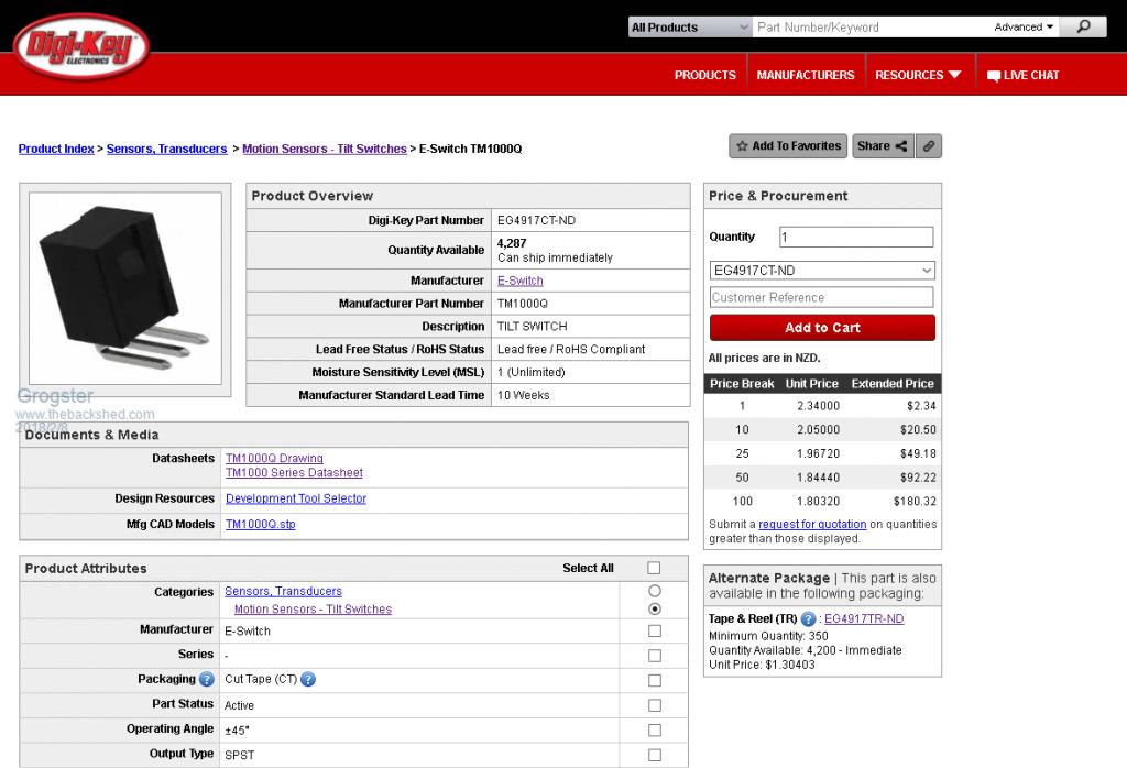 Is anyone else seeing this? I can browse around just fine, and in the case of the tilt-switches I wanted to buy some of, I can see that they say they have 4,287 in stock - great! ![]() ![]() Now, I login and try to add them to my cart, and the available quantity is now 'ERROR', and it simply won't let me add any to my cart, so I can't go any further. ![]() I opened a chat with them, and went through all of this, and even they don't know what is going on, as it works fine for them, so they were saying. Tried another browser, exactly the same problem. Cleared cookies, and logged in again, same problem. Anyone else seeing that? EDIT: I have managed to complete an order, but I had to add to cart what I wanted, and THEN login and complete - then it let me. Odd. Oh well. I bought three different types of tilt sensor to play with. One is another ball-type unit, but it is a gold-plated ball and contacts unit, so says the datasheet, so that alone might solve many of my problems, as the cheap ones from China were.....well......cheap ones from China. Smoke makes things work. When the smoke gets out, it stops! |