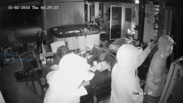 7" tablet, LED Torch, ONE bottle of Gin, out of an entire shelf of spirits. All dressed in disposable Hazmat suits with gloves. Seemed more interested in rifling thru the junk mail & other paper work that was about. All of it insignificant. Opened a key locker that contained a house key & the key to the top of a gun safe. The safe it's self has an electronic lock I installed a few years back, electronics robbed from a small personal safe. Arrive on the first camera at 1:22am, departed the same way 1:37pm. 15 minutes spent totally casing things out. Tried a few doors & windows on their exit. $1000,s of bucks of easily disposable items available & seen but not touched. Battery tools, Radio Scanner, personal items & plenty of grog at the bar. Not sure if they visited the neighbours, but they did don the gloves as they walked in, so it seems like we were the first port of call. Not even the slightest bit concerned about the 9 cameras & monitor displaying their presence. |