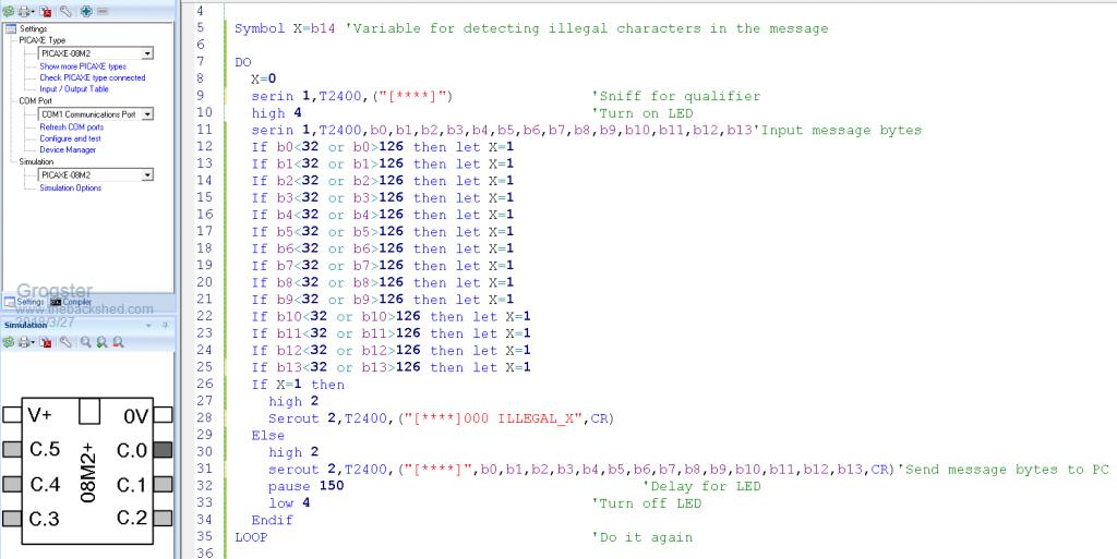 Yes it is. Well spotted. ![]() PICAXE-BASIC has "CR" and "LF" predefined as carriage-return and line-feed respectively. The transmitter nodes DON'T send a CR, they just send the data, which is always 13 bytes. Having sucked them into the PICAXE, once processed, that same data is sent out on another pin to the main system, with a CR added to the end. This is used by the MM main system as an 'End of message marker', allowing for all messages to be buffered in the MM COM port, and then the main loop just looks at the buffer. If there is something there, it reads bytes till it hits a CR, then stops. It then processes THAT message, then does it all again. That way, the beauty of the MM COM port buffer really comes into play as a fully automatic message queue. ![]() By changing the COM port buffer RAM size, you can make the MM automatically queue a HEAP of messages if it has to, all of which will be processed one-by-one, till the buffer is empty, then the system just waits for more to arrive. They are a beautiful thing, those COM port buffers on the MM..... Smoke makes things work. When the smoke gets out, it stops! |