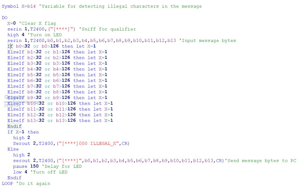 Oh, right. I see. ![]() Yes, in my case, the PICAXE 08M2 is being used as a data-filter on the output of a 'Dumb' RF receiver. When the data is not valid, the receiver just outputs white-noise, which must be filtered out for reliable message reception. The code is single-purpose only, and it just waits for valid data using the PICAXE's useful SERIN and qualifier idea. Once it has sent a message packet to the main system, it just sits there forever waiting on another one to forward. Rogue characters(000-031 and 128-255 decimal) were making it past the original filter code every now and again, and confusing the hell out of the main system. Hence my adding the IF/THEN's to test each of the 13 bytes as valid first.Smoke makes things work. When the smoke gets out, it stops! |