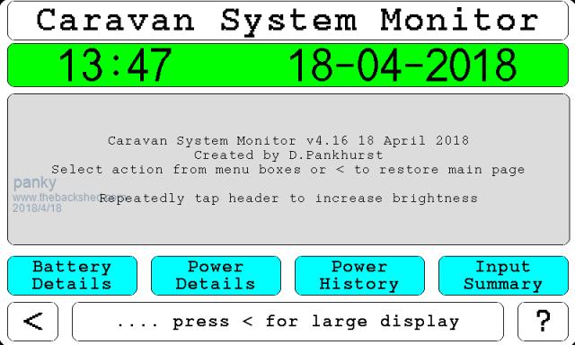 Hi Folks, Been working on this system for about 4 years now - original was on a Colour Maximite. link to zip file There is a detailed explanation together with copies of the programs in the linked .zip file above. The latest incarnation uses a split system - a data collecting "front end" in the front battery boot and a data display "back end" inside the caravan. It also uses a full GUI display and touch interface. The back end program will run in simulate mode if COM1 Tx and Rx are looped to one another. It is still a "work in progress" and I would like to incorporate some of the nice features that other 'shedders' have put up. panky PS. Quick peek at one of the user displays. ![]() ... almost all of the Maximites, the MicromMites, the MM Extremes, the ArmMites, the PicoMite and loving it! |