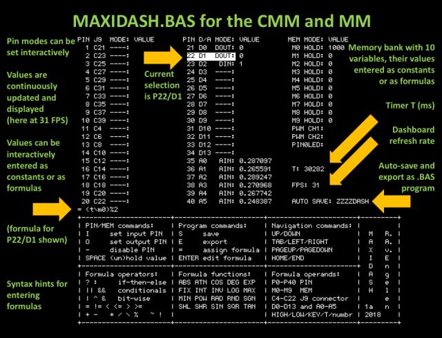 MAXIDASH is a dashboard, and an IDE of sorts, for the (colour) maximite. MAXIDASH is an MMBASIC 4 program that runs on the MM to experiment with an MM and to build event-driven programs. You can interactively control pins/ports and enter values and formulas for pins, pretty much like you would enter values and formulas into a spreadsheet. The formulas can be saved and exported to a stand-alone .BAS program.
