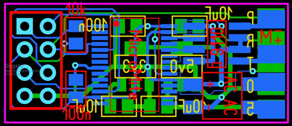 Time for some sleep, but this is what I have so far: ![]() This board contains a MM2 and an SOIC H-bridge to drive the motor. Input can be AC or DC. Current PCB size is 31mm x 13mm - same width as an HC-12 module, and a little shorter. PWM 1A connects to the P pad(for engine lights, perhaps?), and PWM 2A/2B are the motor control PWM channels. The 2x4 pin-header holes are for the ICSP and console connections, although, you would not install the pin-header, as it would make the module to thick. We need to keep a low-profile. ![]() I am thinking about making that 2x4 header into an edge-connector rather then pin-header. This will allow me to shave a few more mm off the length of the PCB, and then you just plug the PCB into an edge-connector socket for programming. To be continued. Right now, I need sleep. Smoke makes things work. When the smoke gets out, it stops! |