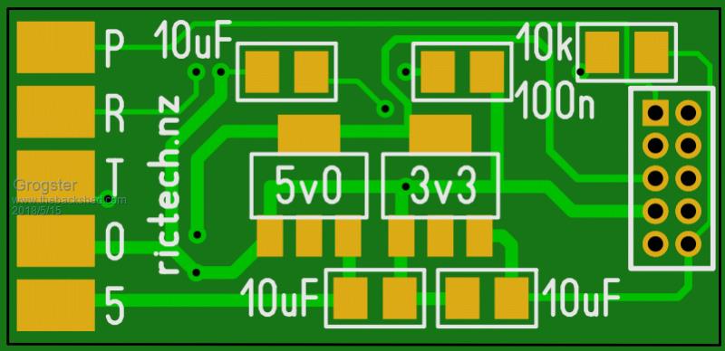 Have changed the 2.54mm pin header, for a 1.27mm female header. These are half the size(obviously), and are only 4mm tall, so they should not get in the way, and this allows easy mounting on a matching jig for programming and testing. ![]() ![]() Size is now 27mm x 13mm, so I have shaved 4mm off the length. ![]() Passives are 0805, regulators are SOT-89, MM2 is SSOP, H-bridge is SOIC. 12v power can be supplied via the header, really just to make programming easy, as that allows the on-board regulators to do their thing without any kind of back-feeding issues. I will keep looking for ways to optimize this layout, as I want to get it as small as possible. I think this is pretty close to as small as we can get it though, without going to four-layer. I'm not prepared to go four-layer just to shave a couple more mm off the size, as four-layer boards are four times the price of double-layer. Smoke makes things work. When the smoke gets out, it stops! |