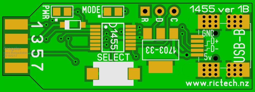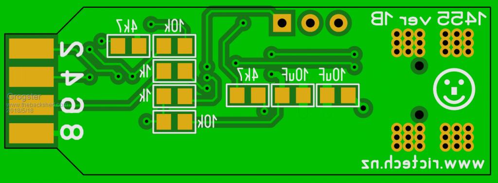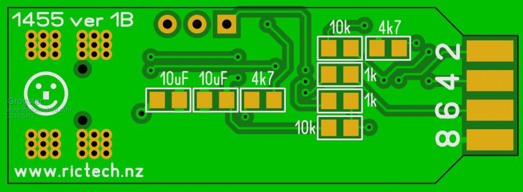 Updated version 1B2 with standard 5-pin 2.54mm ICSP holes for easy programming of the 1455 and a couple of other minor layout tweaks. ![]() ![]() Shown with a PicKit-3 as a size comparison. Smoke makes things work. When the smoke gets out, it stops! |