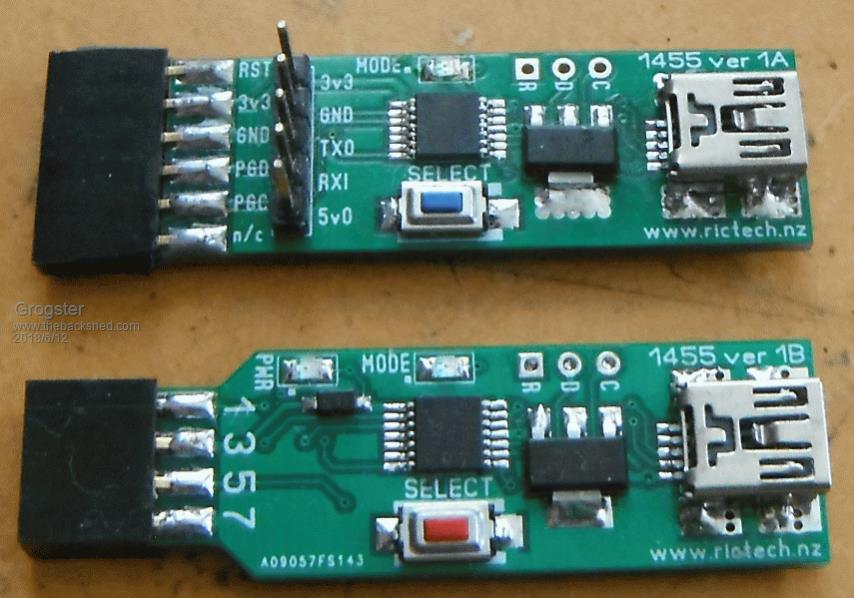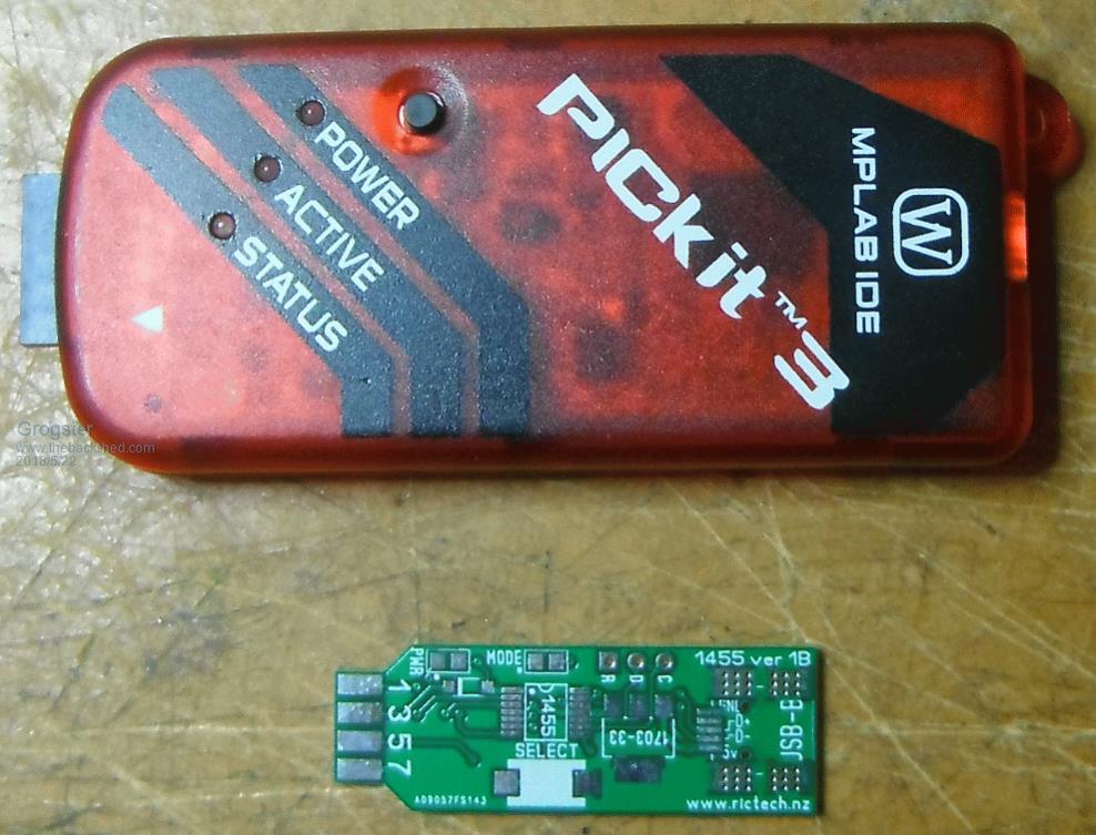 Hi Groggs It took me ages to work out what was going on here. I think I get it. Bit slow!!! There is a double row of male header soldered to the end of the main board with the board between them & they plug into female headers on the MM board which has the ICSP & Console pins wired up as per the "Business End". Is that correct? Also I: Is it possible for your bottom board photos be flipped / rotated end to end. It may make it easier for me to mentally line up the top & bottom components & tracks etc. Also II: How do you load the HEX file using the 1455? Thanks. BTW, you got your workbench tidy yet? ChopperP |