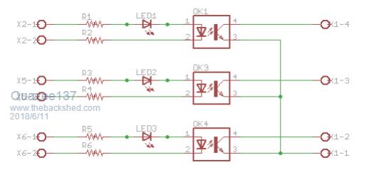 Three components: 180K 1/2W resistor in series with the diodes (slightly under wattage but as it isn't a constant flow it'll be fine), a two-pack opto and then a 10K pull up to VCC for the trannies working in common emitter. Active LO output on the collectors, straight into you sense input.