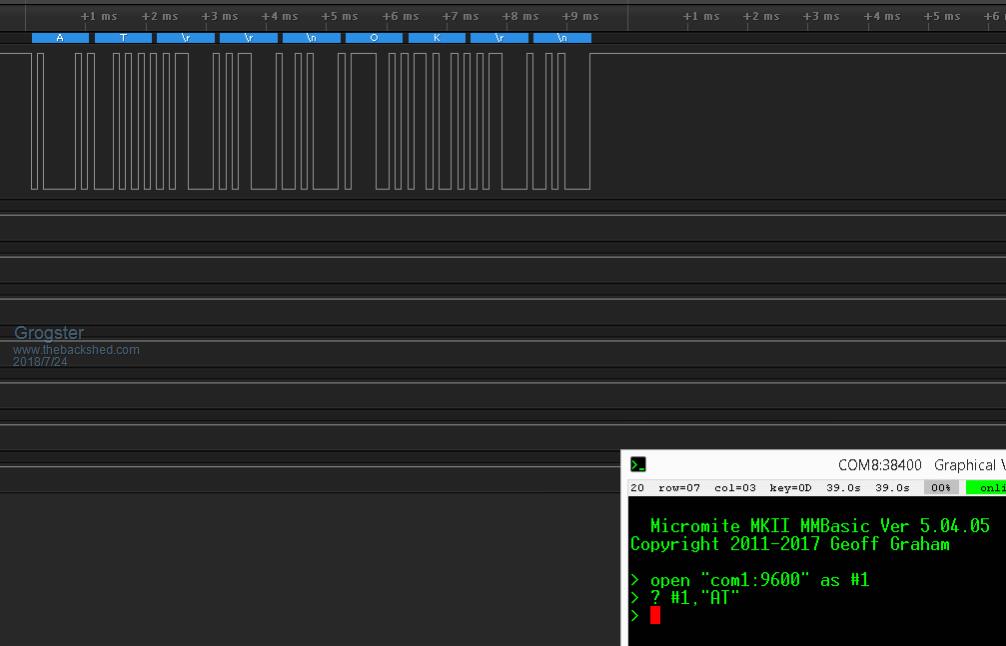 I can SEND it a message from the MM, and I can read back the "OK" it said in response, to the logic analyser, but not on the MM or any USB-serial adaptor. Something odd going on with the TXD from the module. I'm kinda lost now.